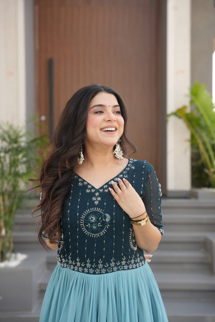 GOWN : Fabric -Faux Blooming Work -Beads Embroidered work and Rich Floral Pedding Digital Print Inner -Cotton (Full Inner Top To Bottom) Length - 56 INCH SLEEVES - Half Sleeves Style - Stitch With Canvas Patt Nack Type - Round Nack (Fully Stitched Ready To Wear)