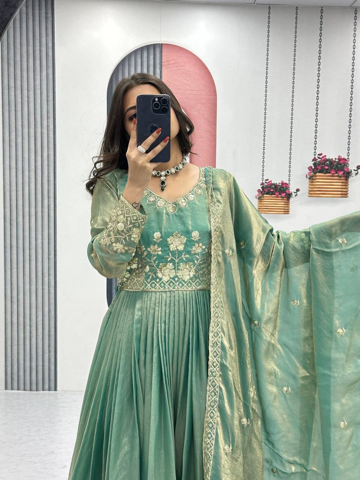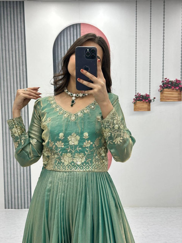 Gown : Fabric:- Fendy Work:- Heavy Embroidery Thread & Sequence WorkLength:- 55/56 Inner:-Micro Cotton Dupatta :Fabric:-Fendy Size:- 2.30 Meter Work:- Embroidered Sequence Work