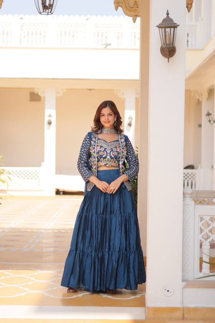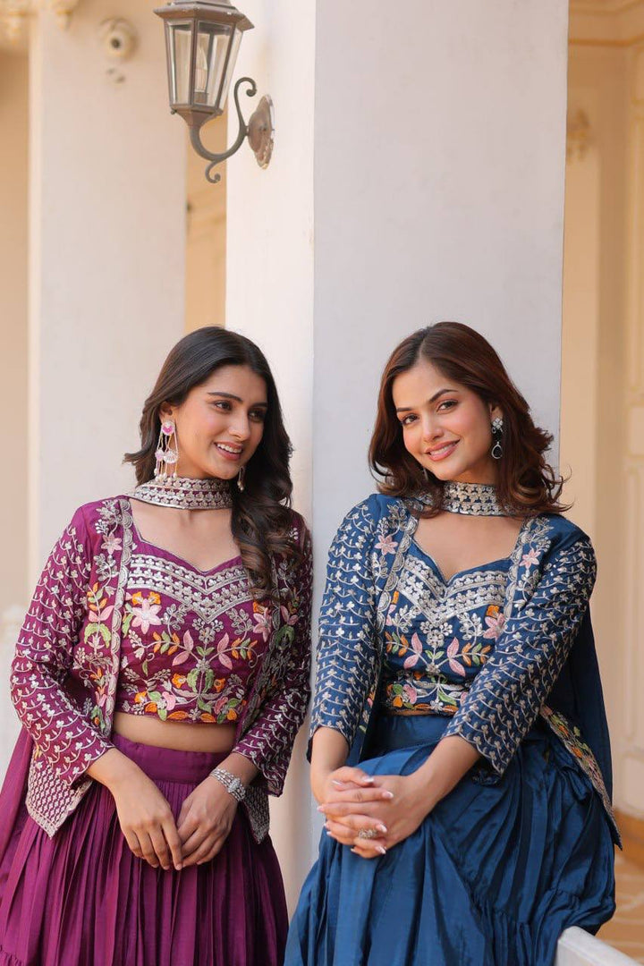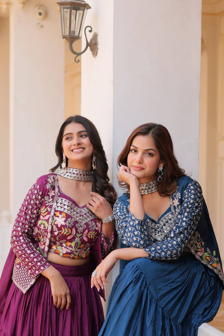 Lehenga : (Stitched)Lehenga Fabric –pure ChinonLehenga Work – Heavy embroidery Thared WorkInner-Micro Flair - 5.50 Metersize-44Choli: (Fully Stitched)Blouse Fabric –pure ChinonBlouse Work– Heavy embroidery Thared WorkInner- Micro Cotton Koti :Dupatta Fabric – pure ChinonDupatta Work–Embroidery Thread WorkInner-Micro Size- 44 Dupatta : Duptta Fabric- pure chinon Duptta Duptta Work- Heavy Embroidery Sequence Work Size- 2.30 Meter Weight-1kg Coluer- 2 two (wine,rama)